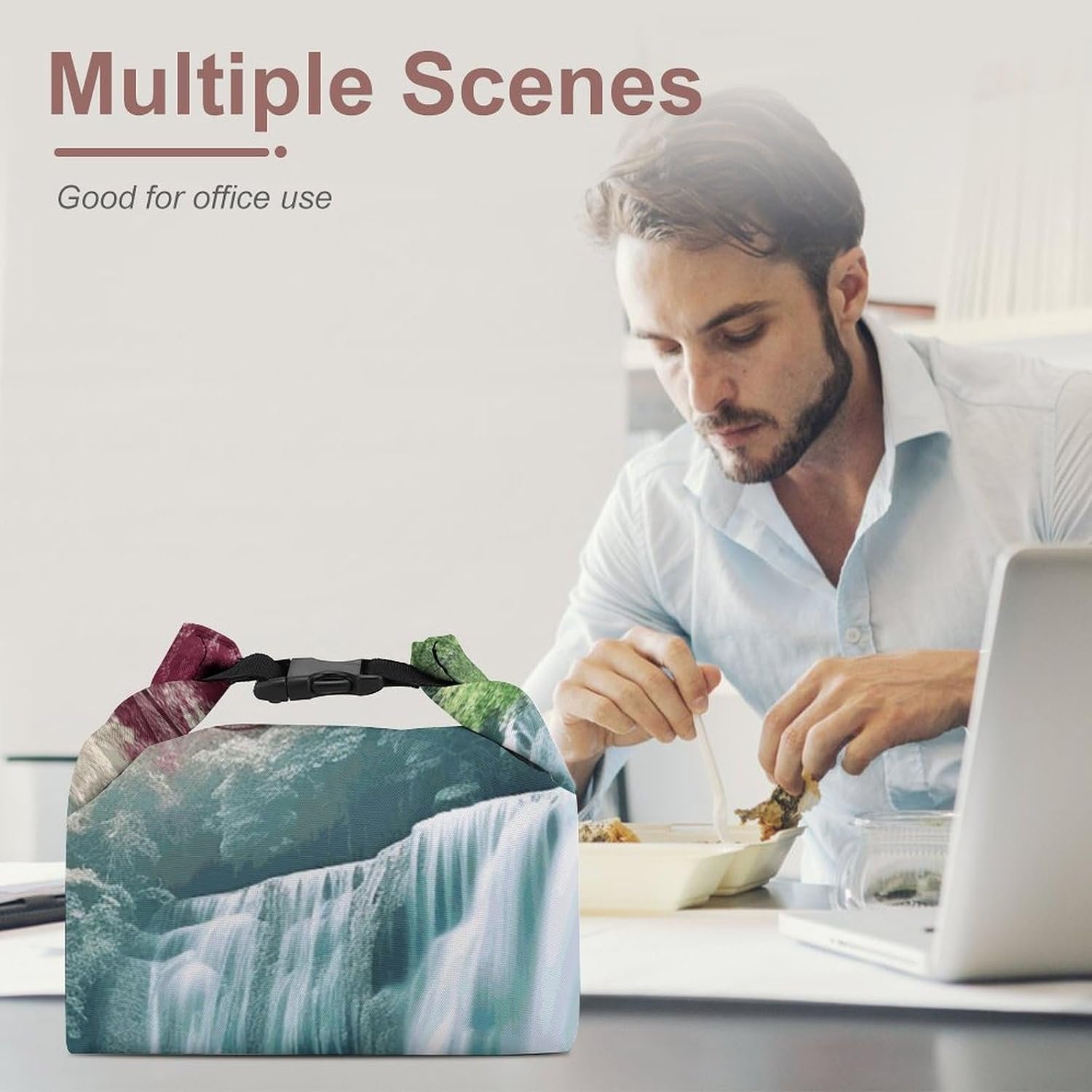 material: This Waterfall Natural Landscape print portable lunch bag is made of high-quality Oxford cloth, which is insulating, easy to fold and durable, ensuring its longevity and value for money. The snap-on handle reduces weight damage and makes it easier for you to carry.