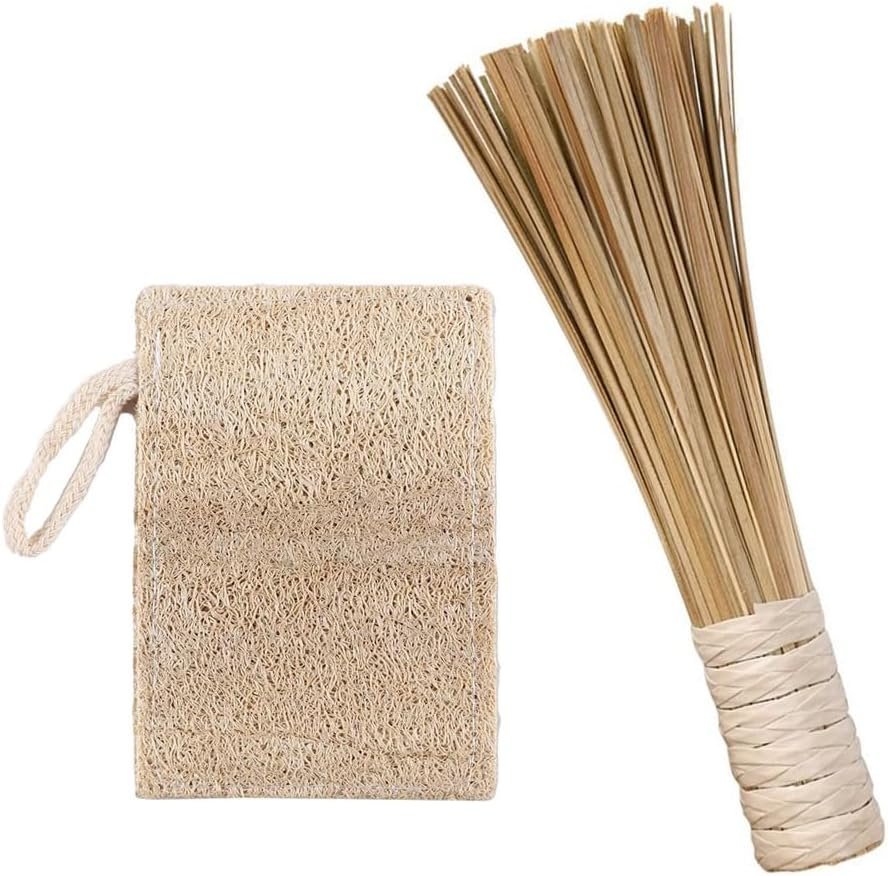 Loofah Plant-Based Dishwashing Scrubber + Bamboo Dish Scrub Brushes, Easy to Brush off Stain,Soft bristles are suitable for cleaning pots/dishes. Hard bristles can remove stubborn stains, suitable for cleaning cast iron pans/kitchen sinks.