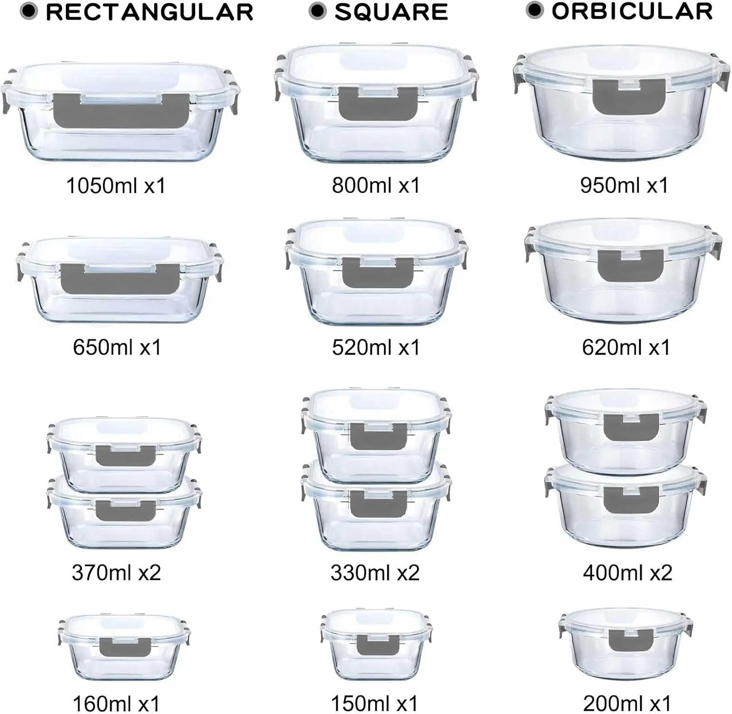 Rectangular containers include1x160ml, 2 x370 ml, 1 x 650 ml, 1 x 1050 ml, square containers include 1x150ml,2 x 380 ml, 1 x 520 ml, 1 x 800 ml, and round containers include 1x200ml,2 x 400 ml, 1 x 620 ml, 1 x 950 ml.